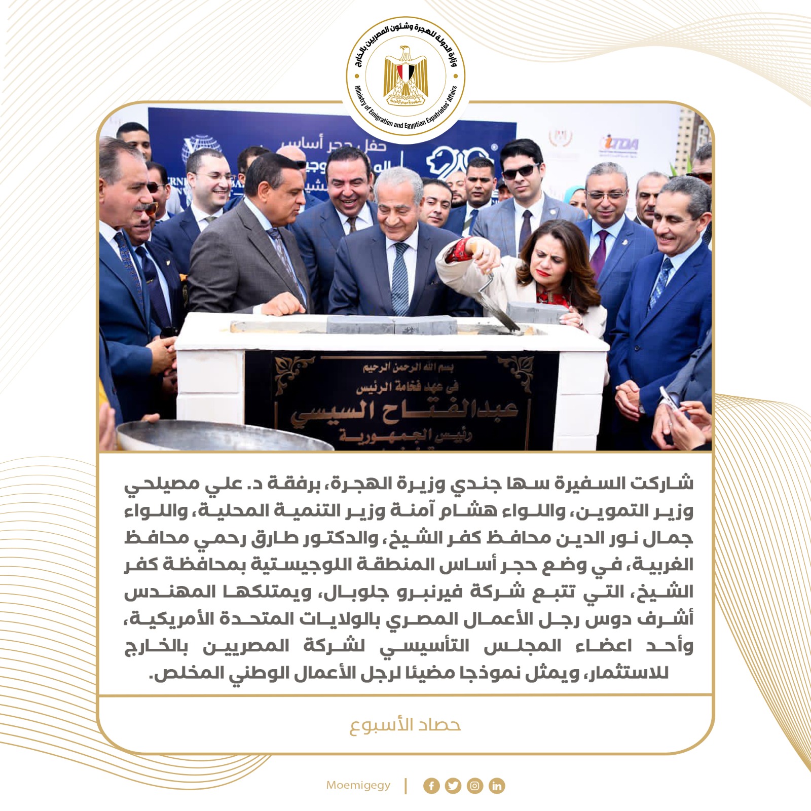 2) شاركت السفيرة سها جندي وزيرة الهجرة، برفقة د. علي مصيلحي وزير التموين، واللواء هشام آمنة وزير التنمية المحلية، واللواء جمال نور الدين محافظ كفر الشيخ، والدكتور طارق رحمي محافظ الغربية، في وضع حجر أساس المنطقة اللوجيستية بمحافظة كفر الشيخ، التي تتبع شركة فيرنبرو جلوبال، ويمتلكها المهندس أشرف دوس رجل الأعمال المصري بالولايات المتحدة الأمريكية، وأحد اعضاء المجلس التأسيسي لشركة المصريين بالخارج للاستثمار. وقالت سيادتها إن م. أشرف دوس يمثل نموذجا مضيئا لرجل الأعمال الوطني المخلص، وذلك لما يقوم به من دور فاعل في تنفيذ العديد من المشروعات الاستثمارية الكبرى في مصر بإجمالي استثمارات يقدر بـ 25 مليار جنيه، وخاصة بعد خبراته الكبيرة والنجاحات اللافتة التي حققها بمشروعاته خارج وداخل البلاد، وهو الأمر الذي يؤكد على قيمة وأهمية المستثمرين المصريين بالخارج ودورهم الفعال والحيوي في بناء القدرات الاقتصادية للدولة.