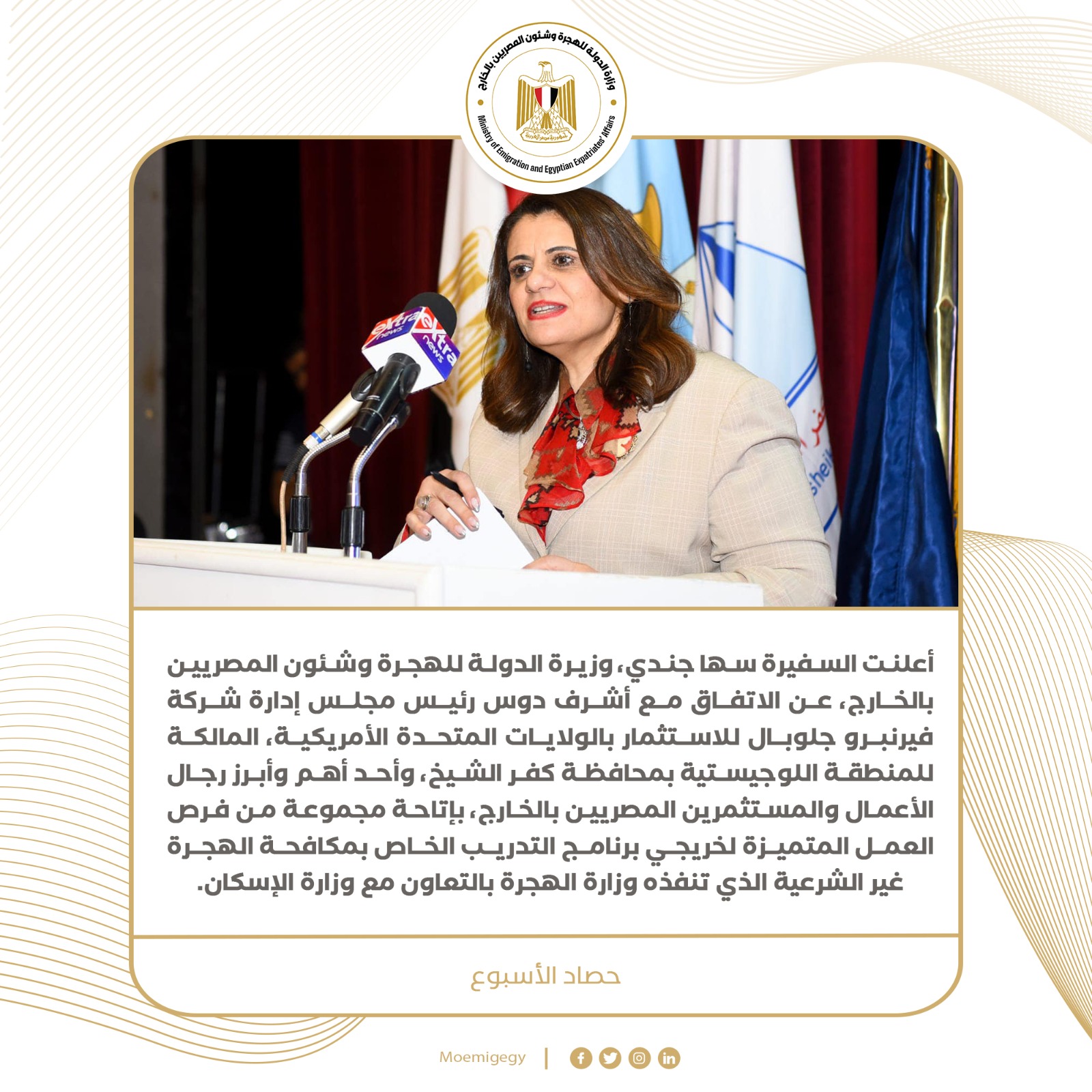 3) أعلنت السفيرة سها جندي، وزيرة الدولة للهجرة وشئون المصريين بالخارج، عن الاتفاق مع أشرف دوس رئيس مجلس إدارة شركة فيرنبرو جلوبال للاستثمار بالولايات المتحدة الأمريكية، المالكة للمنطقة اللوجيستية بمحافظة كفر الشيخ، وأحد أهم وأبرز رجال الأعمال والمستثمرين المصريين بالخارج، بإتاحة مجموعة من فرص العمل المتميزة لخريجي برنامج التدريب الخاص بمكافحة الهجرة غير الشرعية الذي تنفذه وزارة الهجرة بالتعاون مع وزارة الإسكان. وقالت الوزيرة إن هذا التعاون يعكس العلاقات الوطيدة بين الوزارة و م. أشرف دوس، واستمرار للعمل المشترك في مجالات الاستثمار، وكذلك تنفيذ المبادرات الرئاسية “حياة كريمة” و”مراكب النجاة” والتي تهدف للحد من ظاهرة الهجرة غير الشرعية، من خلال التدريب والتأهيل للشباب وكذلك إتاحة فرص عمل بديلة وآمنة لهم.
