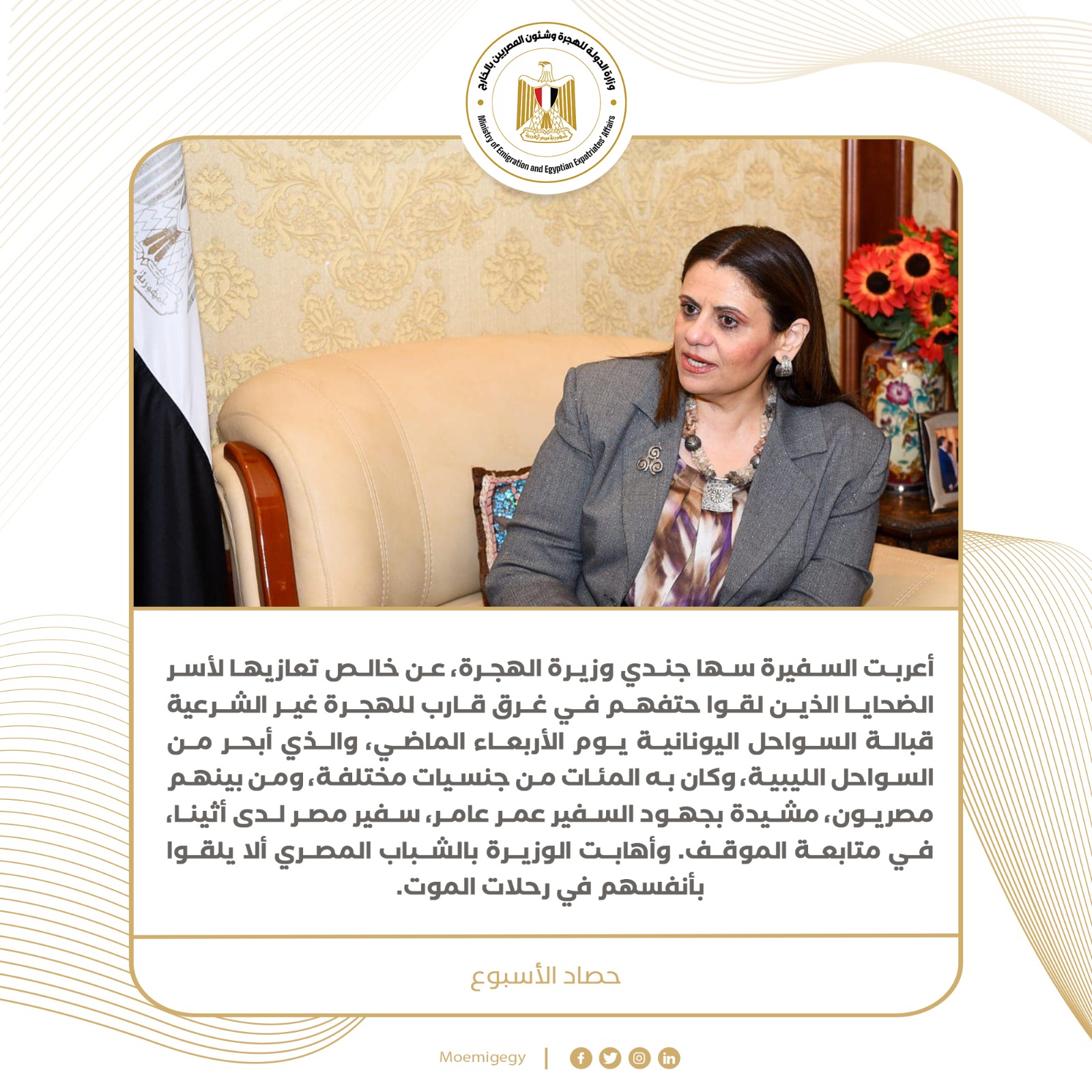 1) أعربت السفيرة سها جندي وزيرة الهجرة، عن خالص تعازيها لأسر الضحايا الذين لقوا حتفهم في غرق قارب للهجرة غير الشرعية قبالة السواحل اليونانية يوم الأربعاء الماضي، والذي أبحر من السواحل الليبية، وكان به المئات من جنسيات مختلفة، ومن بينهم مصريون، مشيدة بجهود السفير عمر عامر، سفير مصر لدى أثينا، في متابعة الموقف. وأهابت الوزيرة بالشباب المصري ألا يلقوا بأنفسهم في رحلات الموت، وأن يحرصوا على السير في الطرق القانونية، والالتحاق ببرامج التدريب والتأهيل من أجل التوظيف التي تنظمها الوزارة لإكساب الشباب المهارات التي تؤهلهم للعمل في المشروعات القومية أو فرص آمنة بالخارج.