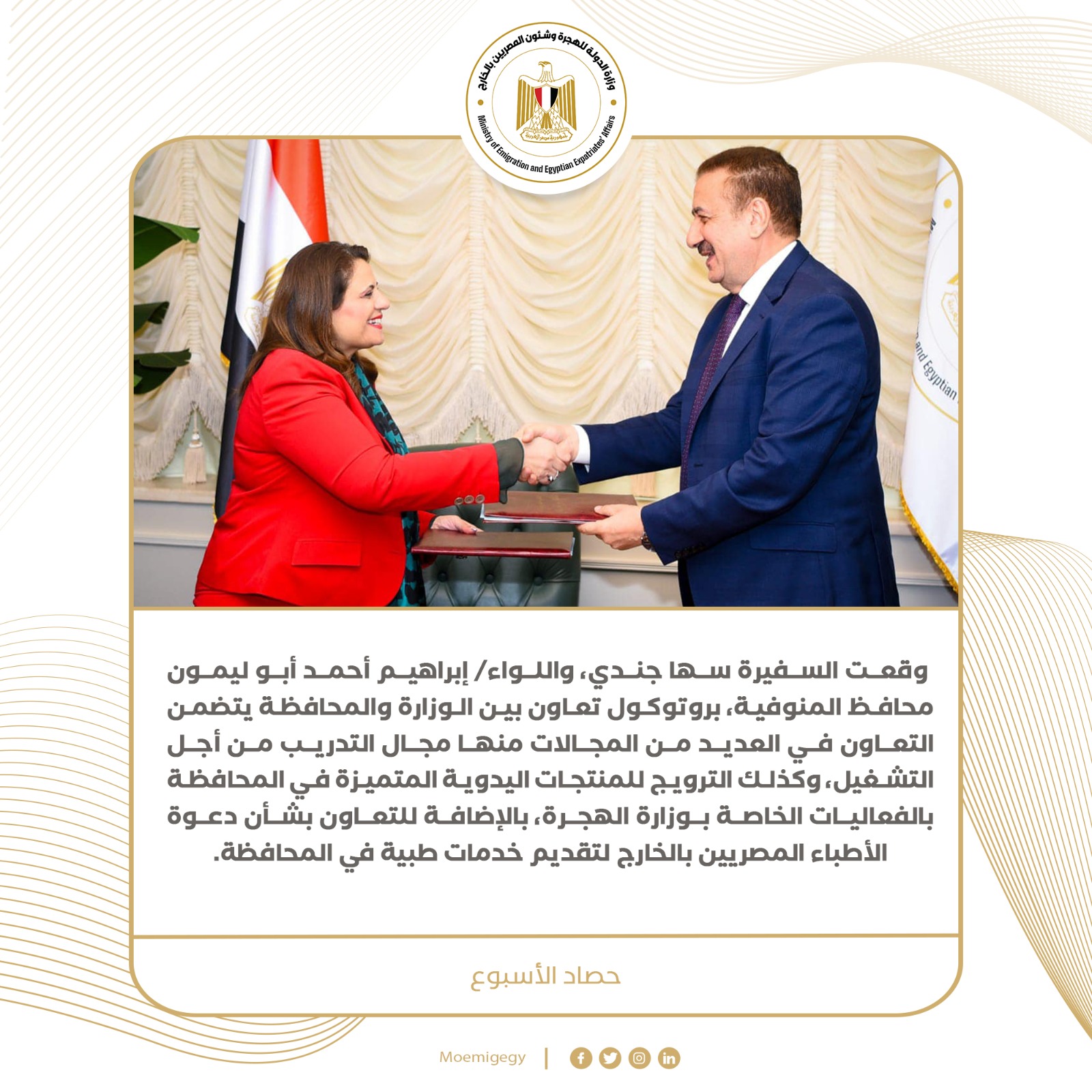 9) في إطار تنفيذ المبادرة الرئاسية “مراكب النجاة” للتوعية بمخاطر الهجرة غير الشرعية والحد منها، ونتيجة لزيارة السيدة وزيرة الهجرة إلى محافظة المنوفية في فبراير الماضي، وقعت السفيرة سها جندي، واللواء/ إبراهيم أحمد أبو ليمون محافظ المنوفية، بروتوكول تعاون بين الوزارة والمحافظة يتضمن التعاون في العديد من المجالات منها مجال التدريب من أجل التشغيل، وكذلك الترويج للمنتجات اليدوية المتميزة في المحافظة بالفعاليات الخاصة بوزارة الهجرة، بالإضافة للتعاون بشأن دعوة الأطباء المصريين بالخارج لتقديم خدمات طبية في المحافظة.