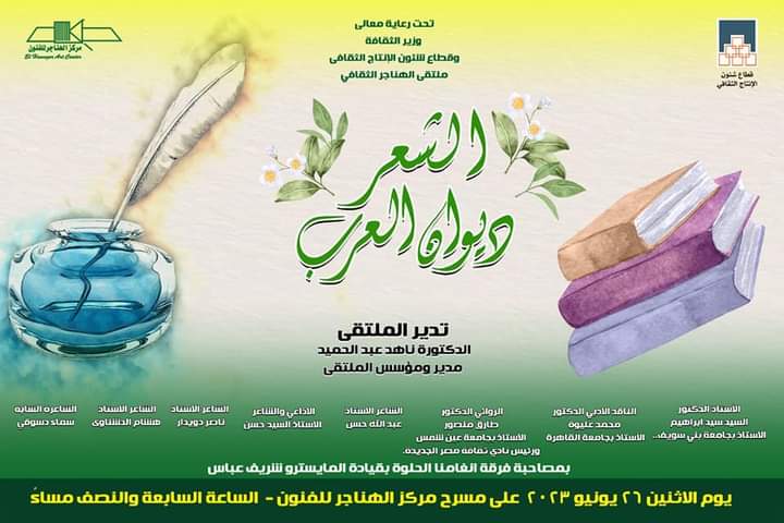 يقيم قطاع شئون الإنتاج الثقافى برئاسة المخرج خالد جلال، ملتقى الهناجر الثقافي، حيث لقاء الأدباء مع الشعراء في ملتقى “الشعر.. ديوان العرب” وذلك فى السابعة والنصف من مساء يوم الاثنين 26 يونيو الجارى، بمركز الهناجر للفنون برئاسة الفنان شادى سرور.