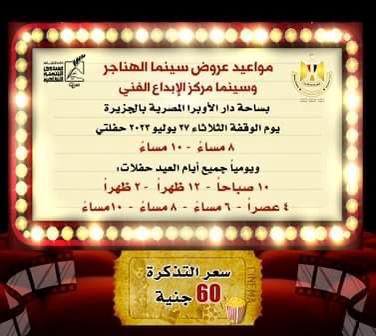 تبدأ ولأول مرة عروض أحدث الأفلام السينمائية بأسعار مخفضة بسينما الهناجر وسينما مركز الإبداع الفني بساحة دار الأوبرا المصرية، التابعتين لقطاع صندوق التنمية الثقافية، وذلك تزامنا مع الاحتفال بـ عيد الأضحى المبارك.