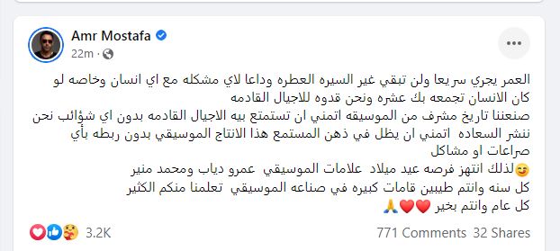 هنأ الفنان عمرو مصطفى، النجم عمرو دياب بعيد ميلاده، مؤكدا أن بينهما عشرة عمر ونسى الخلافات بينهما، وكتب عمرو مصطفى، قائلا:” العمر يجري سريعا ولن تبقي غير السيرة العطرة وداعا لأي مشكله مع أي إنسان وخاصه لو كان الإنسان تجمعه بك عشره ونحن قدوه للأجيال القادمة”.