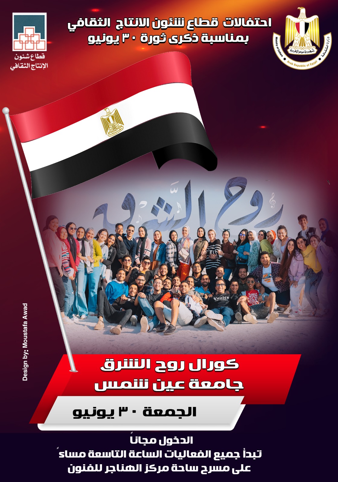 تنطلق فعاليات احتفال قطاع شؤون الإنتاج الثقافى، برئاسة المخرج خالد جلال، بذكرى ثورة 30 يونيو، فى التاسعة من مساء غد الجمعة على مسرح ساحة مركز الهناجر للفنون، تحت رعاية الدكتورة نيفين الكيلانى، وزيرة الثقافة.