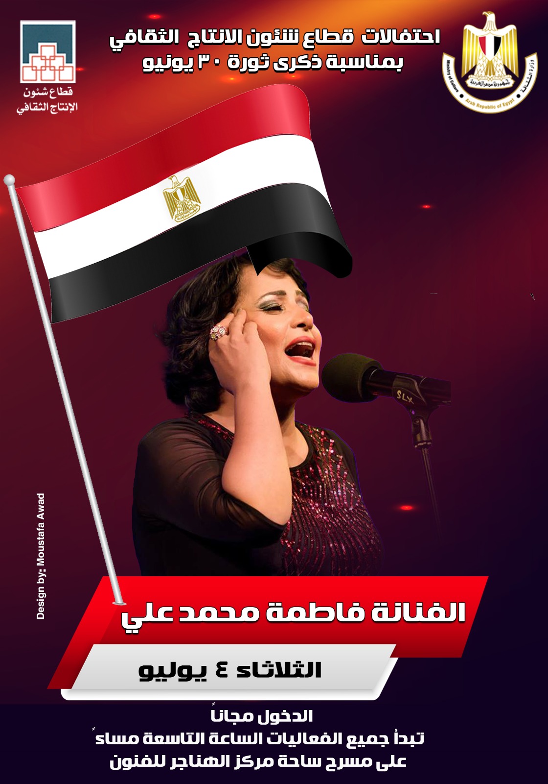 “فاطمة محمد على” تحيى الليلة الخامسة لاحتفال الإنتاج الثقافى بثورة ٣٠ يونيو