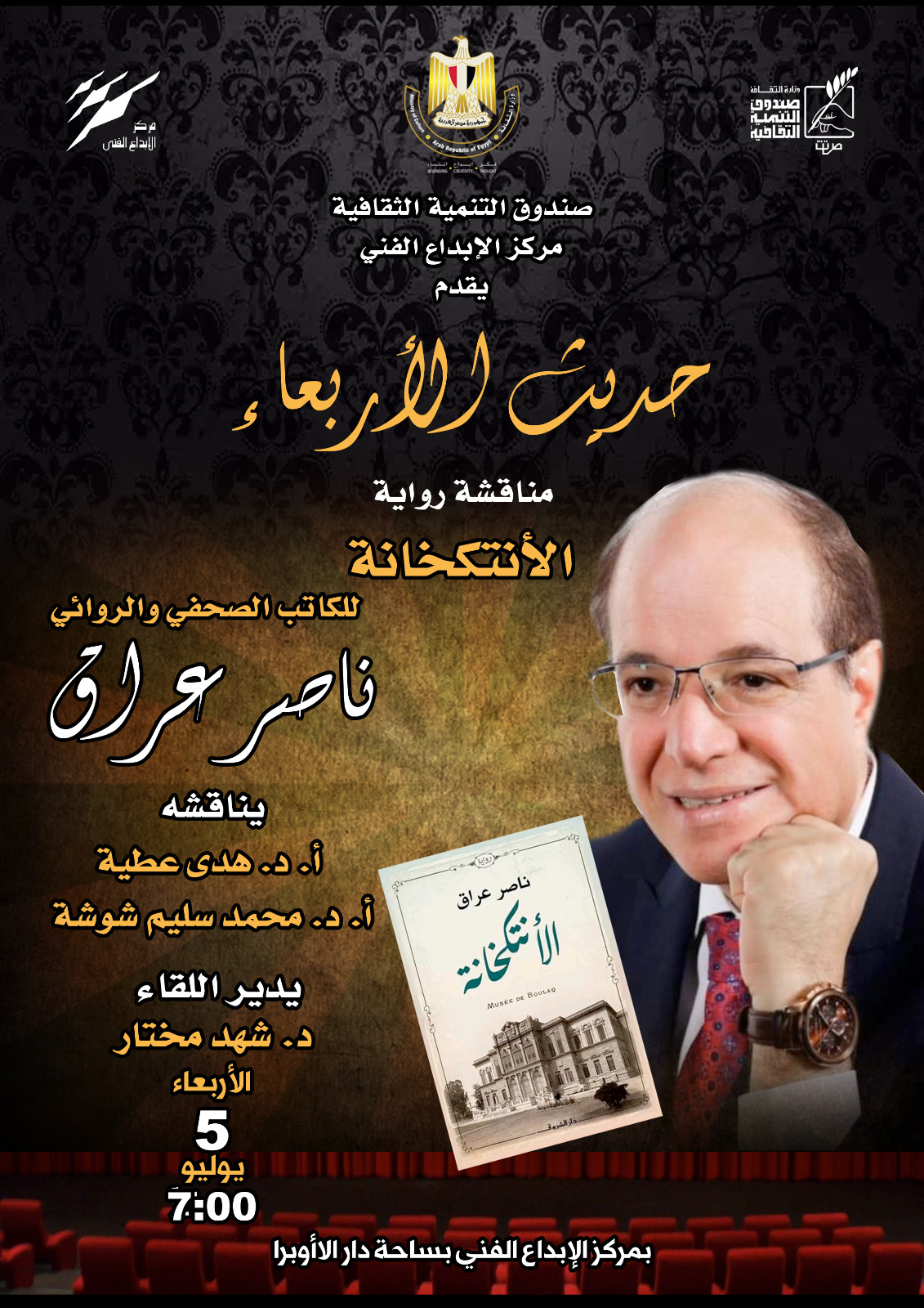 يستضيف صالون “حديث الأربعاء” فى السابعة مساء الاربعاء 5 يوليو بمركز الابداع الفنى التابع لقطاع صندوق التنمية الثقافية الكاتب الصحفي والروائي ناصر عراق، ومناقشة لاحدث رواياته الأنتكخانة”، يناقشه الدكتورهدى عطية أستاذ النقد الأدبي الحديث بقسم اللغة العربية وآدابها بكلية الآداب جامعة عين شمس ورئيس شعبة النقد والدراسات الأدبية باتحاد كتاب مصر، و دكتور محمد سليم شوشة الأستاذ المساعد بقسم الدراسات الأدبية بكلية دار العلوم جامعة الفيوم والفائز بجائزة الدولة التشجيعية فرع “الدراسات الأدبية واللغوية”. تخرج ناصر عراق من كلية الفنون الجميلة عام 1984 ، يعمل حالياً مدير تحرير مجلة “حروف عربية” الصادرة عن مؤسسة ندوة الثقافة والعلوم بدبي، شارك في تأسيس مجلة “دبي الثقافية” عام 2002، وكان أول مدير تحرير لها. أصدر عراق 12 رواية رشح بعضها لعدد من الجوائز منها: “العاطل” التي رٌشحت للقائمة القصيرة للجائزة العالمية للرواية العربية عام 2012، ووصلت روايته “نساء القاهرة. دبي” إلى القائمة القصيرة في مسابقة “أرى روايتي” الدورة الأولى والتي أطلقتها مؤسسة أبوظبي للإعلام عام 2018، كما حصلت روايته “الأزبكية” على جائزة كتارا للرواية العربية سنة 2016 وترجمت إلى الإنجليزية والفرنسية، يدير اللقاء الناقدة دكتور شهد مختار.