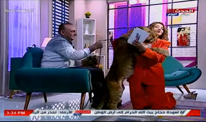 في أولى حلقات برنامجها على قناة الحدث اليوم استضافت الفنانة مادلين طبر في برنامج «قعدة مع مادلين» مدرب الأسود محمد الحلو، وفي سابقة أولى من نوعها تجرأت مادلين طبر وخلعت حذائها وتوجهت للأسد الكبير والمسمى بـ «روماريو» بعدما رأت ان الأسد الصغير «سيمبا» قد نام على هواء تكييف الاستوديو ،وجلست بجانبه ارضا وكعادتها مع كلابها الاليفة حضنت «مادلين» الأسد وبادلها «روماريو» الحضن وكأنها عشرة قديمة، ولكنها اثناء حضنها له بقلب جامد فهي لا تخاف الحيوانات، لم يفوت الفرصة في ترك علامة على زند يد مادلين اليسرى بعضة من انيابه تعبيرا عن امتنانه لحضنها مباشرة، فهو بحسب قول مدربه، لم يحضنه انسان من قبل.