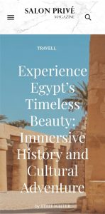 أبرز موقع مجلة Salon Privé من خلال تقرير مصور عدد من أهم المقاصد السياحية المصرية؛ حيث سلط الضوء على مدن القاهرة والإسكندرية وشرم الشيخ والأقصر والتي لاتزال تجذب المسافرين من جميع أنحاء العالم.