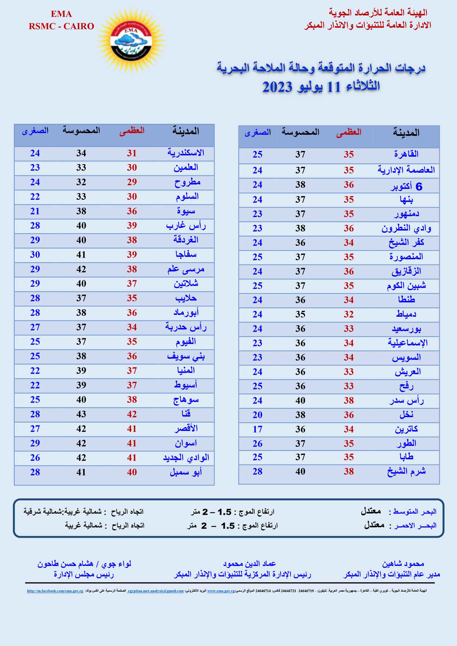 أوضحت الأرصاد الجوية أن حركة الملاحة البحرية بالنسبة لحالة البحر المتوسط تكون مضطربة وارتفاع الموج فيه يتراوح ما بين 2.5 و3.5 متر والرياح السطحية شمالية غربية، أما بالنسبة لحالة البحر الأحمر تكون معتدلة وارتفاع الموج فيه يتراوح ما بين 1.5 إلى 2 متر والرياح السطحية شمالية غربية.