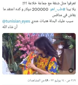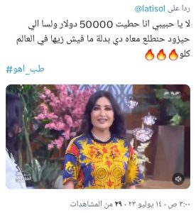 ويصل سعر البدلة حتى الآن في المزاد إلى 200 ألف دولار بعد أن بدأ بمبلغ 5 ألاف دولار، وتداول رواد السوشيال ميديا مقطع من الحلقة تقول خلاله لطيفة جملة “طب اهو” وهي تقوم بخلع جاكيت البدلة، بعد أن قال البعض أن البدلة ليست هي نفس البدلة التي ظهرت بها في الكليب منذ 30 عاما، لأنها لم تكن مرتديه الجاكيت، مما جعلها تخلع الجاكيت على الهواء.
