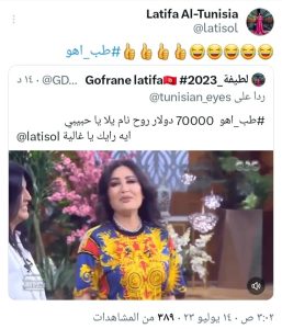 بعد النجاح الكبير الذي حققته حلقات النجمة لطيفة مع الإعلامية منى الشاذلي ببرنامج “معكم منى الشاذلي” على شاشة قناة “cbc”، وظهور لطيفة بنفس الزي الذي ارتدته منذ 30 عاما في فيديو كليب “بحب في غرامك”، أطلق جمهور لطيفة هاشتاج عبر تويتر يطالبون بعمل مزاد لشراء البدلة التي ارتدتها لطيفة في الكليب، وأعادت إرتدائها مع منى الشاذلي، ويحمل الهاشتاج عنوان #مزاد_بدلة_لطيفة.