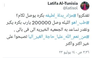 وتفاعلت النجمة لطيفة مع الفكرة، وقامت بنشر المزاد عبر صفحتها الرسمية على موقع التواصل الاجتماعي يوتيوب، ودونت “طب اهو”، ليشارك جمهورها بكثافة، إذ قررت أن تتبرع بالمبلغ للأعمال الإنساني ودعم عدد من الجمعيات الخيرية، إذ كتبت عبر صفحتها على تويتر: تفتكروا مزاد بدلة لطيفه بكره يوصل لكام؟، “طب اهو”، الليله وصل 200000 يارب بكره يكبر ونقدر نساعد به الجمعيه الخيريه اللي فى بالى.