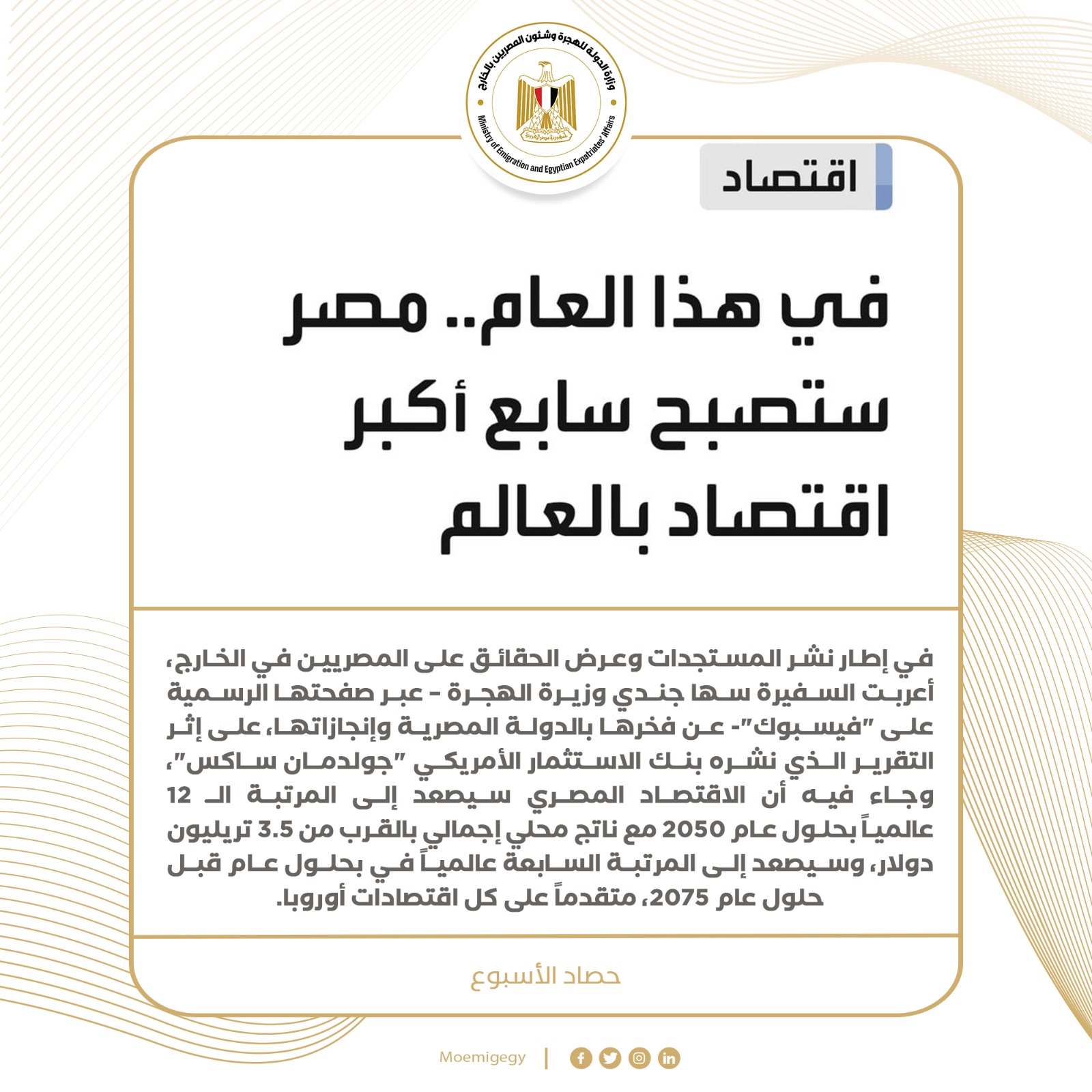 9) في إطار نشر المستجدات وعرض الحقائق على المصريين في الخارج، أعربت السفيرة سها جندي وزيرة الهجرة – عبر صفحتها الرسمية على “فيسبوك”- عن فخرها بالدولة المصرية وإنجازاتها، على إثر التقرير الذي نشره بنك الاستثمار الأمريكي “جولدمان ساكس”، وجاء فيه أن الاقتصاد المصري سيصعد إلى المرتبة الـ 12 عالمياً بحلول عام 2050 مع ناتج محلي إجمالي بالقرب من 3.5 تريليون دولار، وسيصعد إلى المرتبة السابعة عالمياً في بحلول عام قبل حلول عام 2075، متقدماً على كل اقتصادات أوروبا، وقالت الوزيرة: “شهادات وإشادات المؤسسات العالمية تثبت دوما أننا على الطريق الصحيح بفضل الإجراءات والإصلاحات الاقتصادية التي تقوم بها الدولة المصرية”.