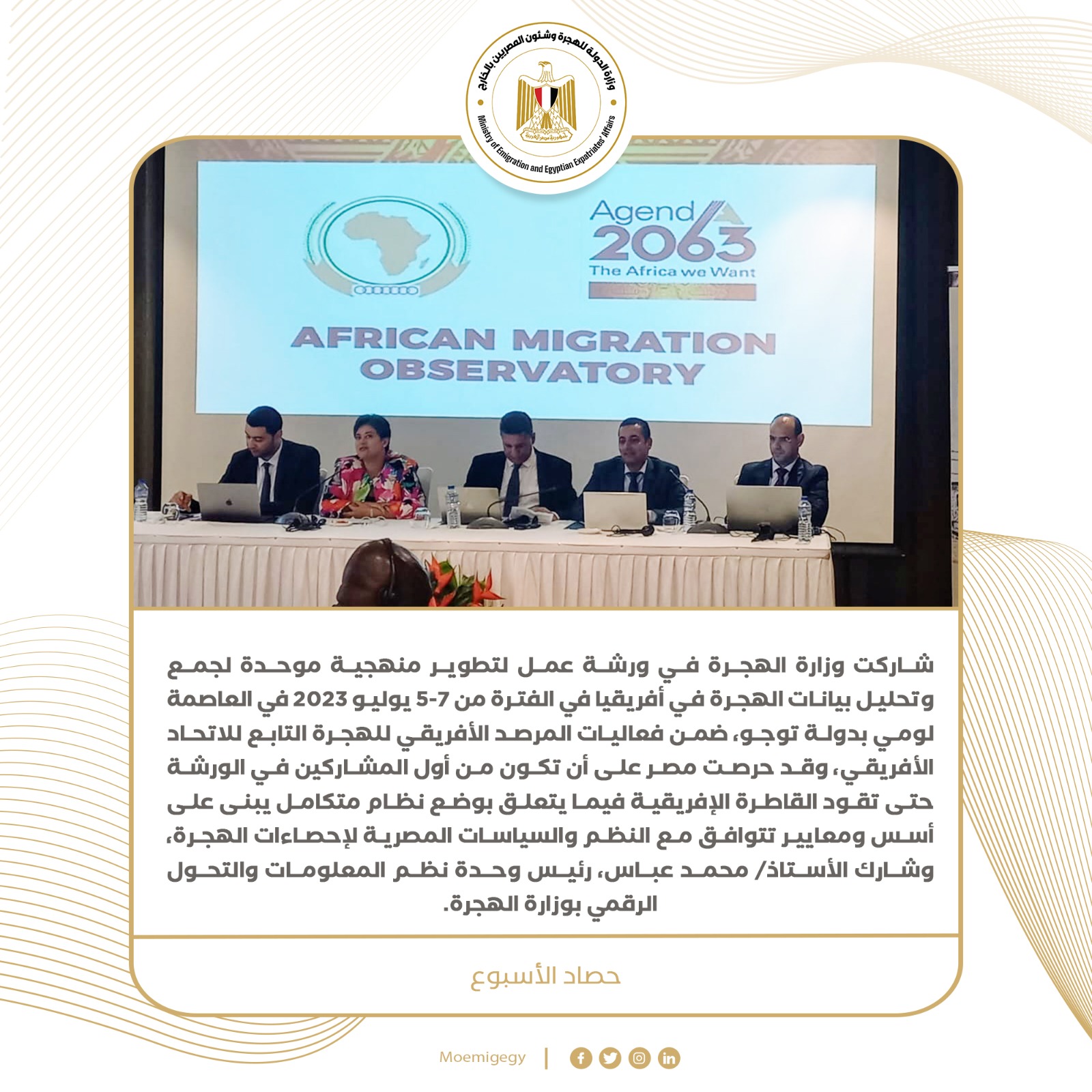 3) شاركت وزارة الهجرة في ورشة عمل لتطوير منهجية موحدة لجمع وتحليل بيانات الهجرة في أفريقيا في الفترة من ٥-٧ يوليو ٢٠٢٣ في العاصمة لومي بدولة توجو، ضمن فعاليات المرصد الأفريقي للهجرة التابع للاتحاد الأفريقي، وقد حرصت مصر على أن تكون من أول المشاركين في الورشة حتى تقود القاطرة الإفريقية فيما يتعلق بوضع نظام متكامل يبنى على أسس ومعايير تتوافق مع النظم والسياسات المصرية لإحصاءات الهجرة، حيث شارك الأستاذ/ محمد عباس، رئيس وحدة نظم المعلومات والتحول الرقمي بوزارة الهجرة، في ورشة العمل واستعرض عددا من مبادرات ومشروعات الوزارة ودور التحول الرقمي في تحقيق الأهداف.