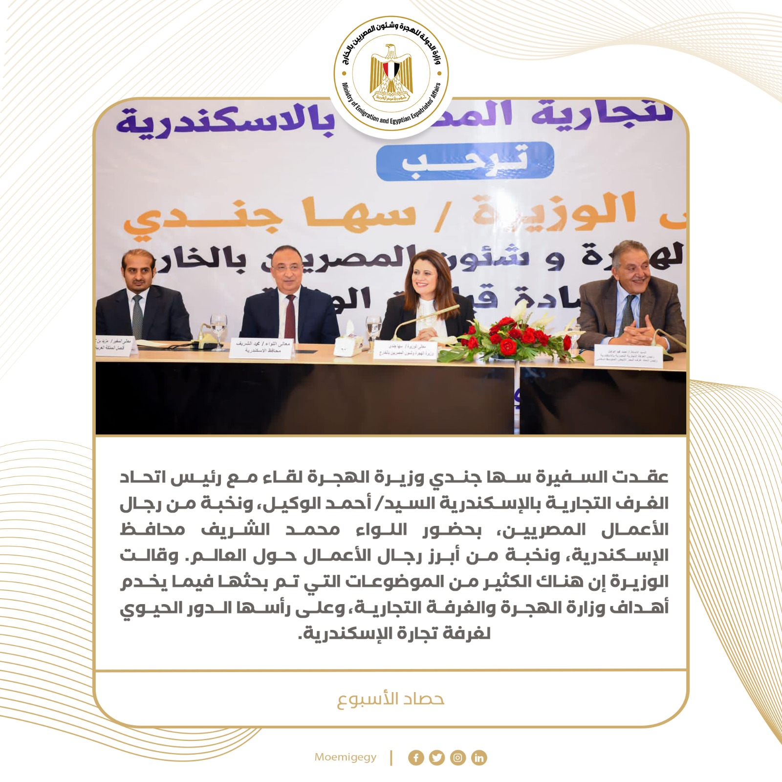 6) عقدت السفيرة سها جندي وزيرة الهجرة لقاء مع رئيس اتحاد الغرف التجارية بالإسكندرية السيد/ أحمد الوكيل، ونخبة من رجال الأعمال المصريين، بحضور اللواء محمد الشريف محافظ الإسكندرية، ونخبة من أبرز رجال الأعمال حول العالم. وقالت الوزيرة إن هناك الكثير من الموضوعات التي تم بحثها فيما يخدم أهداف وزارة الهجرة والغرفة التجارية، وعلى رأسها الدور الحيوي لغرفة تجارة الإسكندرية، مشيرة إلى دور المركز المصري الألماني الذي يعد الذراع التدريبي للوزارة، ونستهدف الترويج لتجربة المركز على مستوى دول المتوسط.