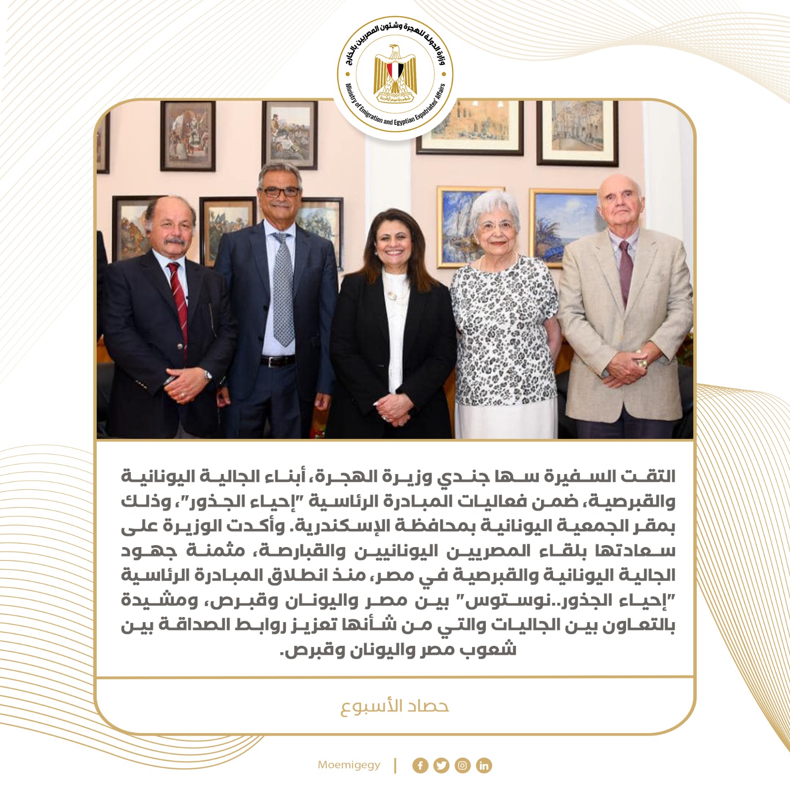 7) التقت السفيرة سها جندي وزيرة الهجرة، أبناء الجالية اليونانية والقبرصية، ضمن فعاليات المبادرة الرئاسية “إحياء الجذور”، وذلك بمقر الجمعية اليونانية بمحافظة الإسكندرية. وأكدت الوزيرة على سعادتها بلقاء المصريين اليونانيين والقبارصة، مثمنة جهود الجالية اليونانية والقبرصية في مصر، منذ انطلاق المبادرة الرئاسية “إحياء الجذور..نوستوس” بين مصر واليونان وقبرص، ومشيدة بالتعاون بين الجاليات والتي من شأنها تعزيز روابط الصداقة بين شعوب مصر واليونان وقبرص، انطلاقًا من كونها المبادرة الأولى من نوعها التي تهدف إلى إحياء الاحتفاء الشعبي بالجاليات الأجنبية التي كانت تعيش في مصر.