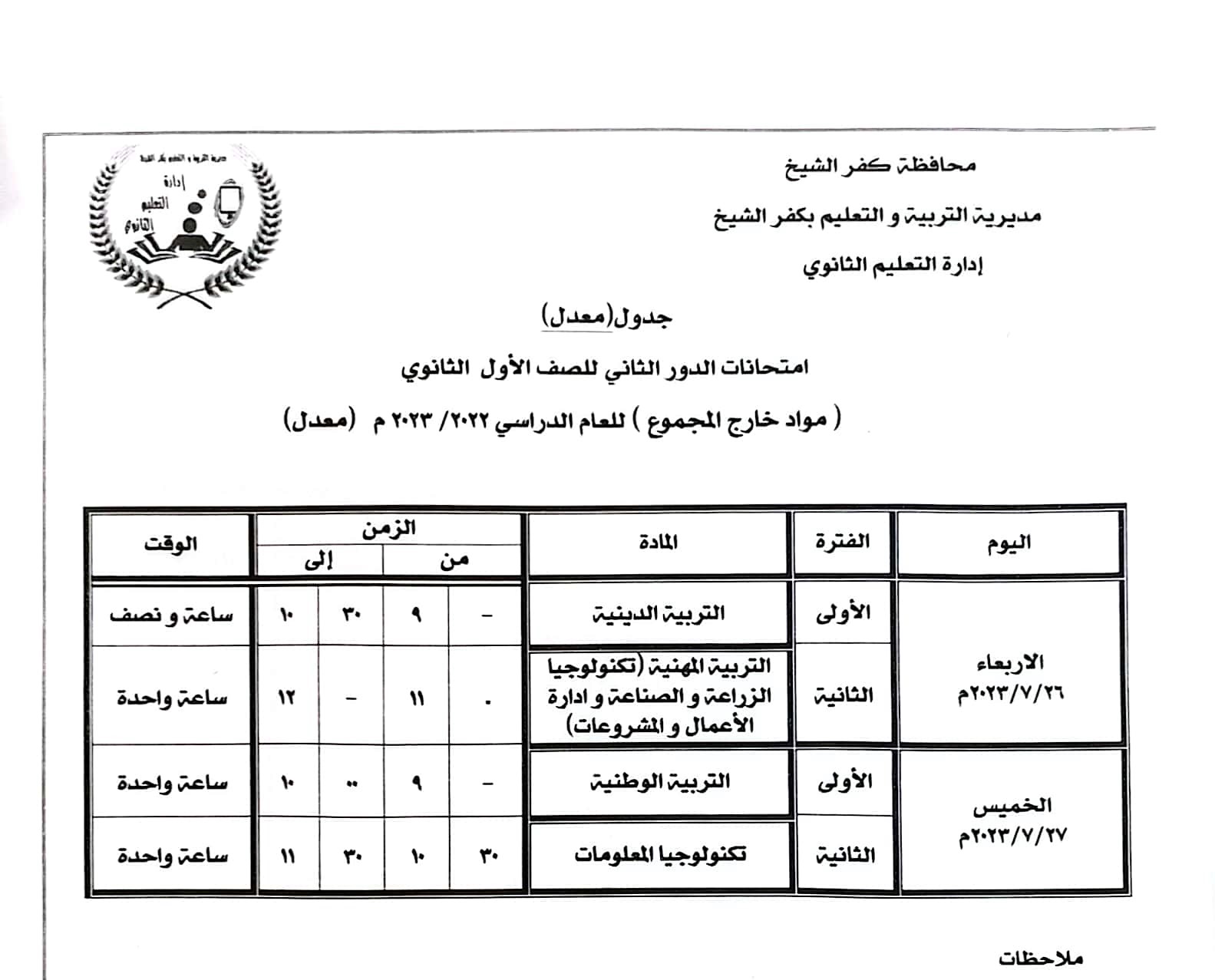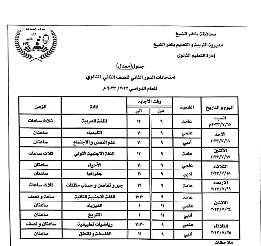 وحرصا من اللواء جمال نور الدين، محافظ كفر الشيخ، على قضاء الطلاب وأولياء والمعلمين الإجازات الرسمية فوجه محافظ كفر الشيخ، محمد عبدالله، وكيل الوزارة، بتعديل امتحانات الدور الثاني على أن تبدأ جميعها الاثنين 24 يوليو. كما قررمحافظ كفر الشيخ تعديل جدول النقل بدء أيام الخميس 19 يوليو، والسبت 21 يوليو والأحد 22 يوليو، ليوم الاثنين 24 يوليو، حسب الجداول المرفقة.