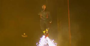 وظهر وهو يطير في السماء باستخدام الحبال، وسط تفاعل كبير من الجمهور على دخوله المفاجئ والغير متوقع.