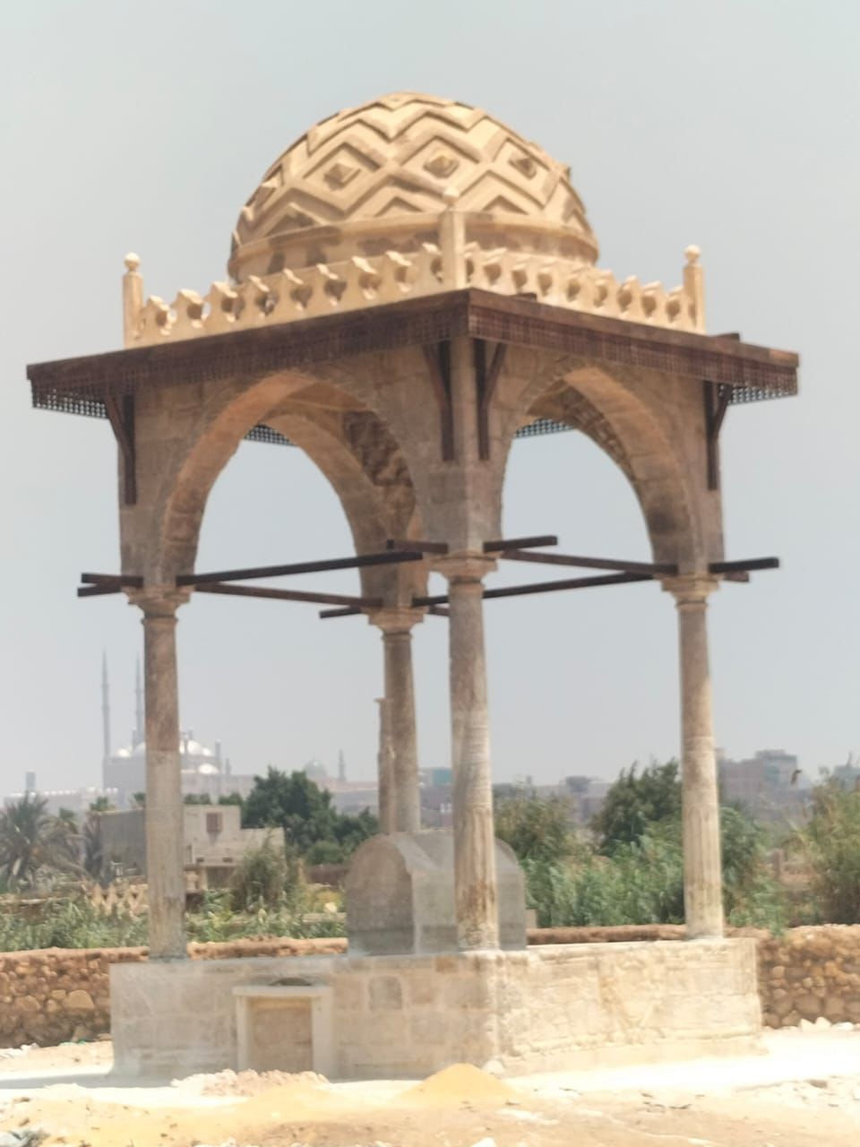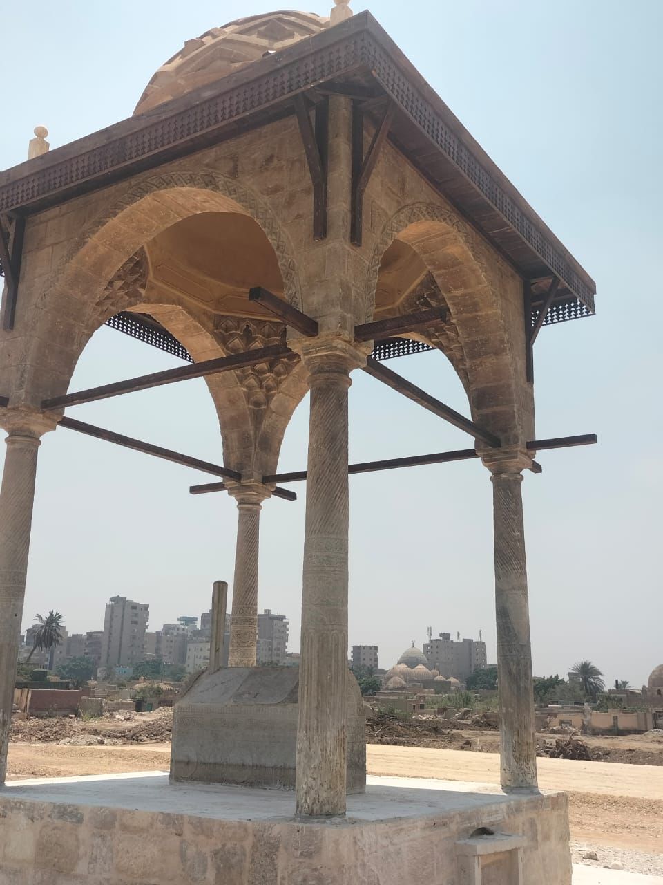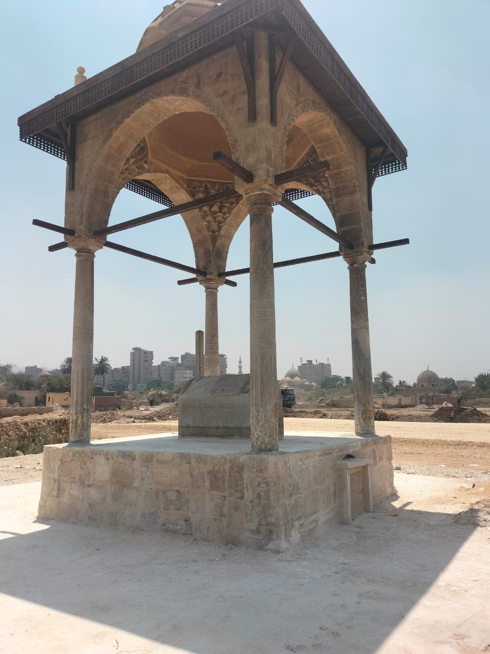 وأوضح د. مصطفى وزيري الأمين العام للمجلس الأعلى للآثار، أن عملية فك القبة من موقعها الأصلي وإعادة تركيبها وترميمها بموقها الجديد، الذي يقع على بعد 30 مترا من موقعها الأصلي، استغرقت ثلاثة أشهر من العمل الشاق والجاد وذلك لحمايتها والحفاظ عليها من المياه الجوفية التي غمرت جزء منها ونمو وانتشار نبات الهيش حولها.
