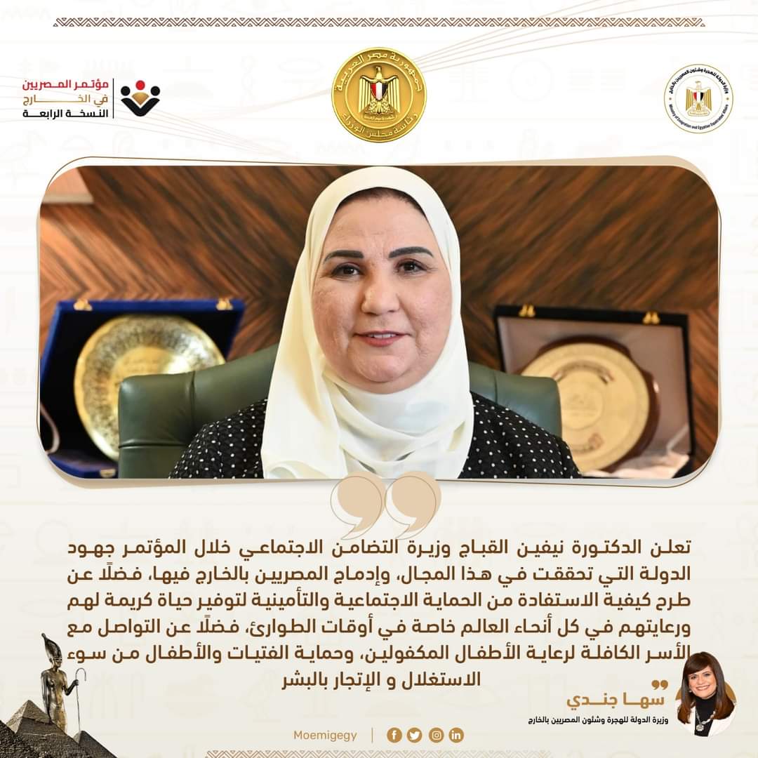 وتعلن فيه ” الدكتورة نيفين القباج وزيرة التضامن الاجتماعي جهود الدولة التي تحققت في هذا المجال، وإدماج المصريين بالخارج فيها، فضلًا عن طرح كيفية الاستفادة من الحماية الاجتماعية والتأمينية لتوفير حياة كريمة لهم ورعايتهم في كل أنحاء العالم خاصة في أوقات الطوارئ، فضلًا عن التواصل مع الأسر الكافلة لرعاية الأطفال المكفولين، وحماية الفتيات والأطفال من سوء الاستغلال والإتجار بالبشر”