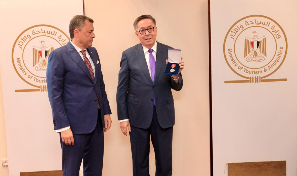 تسلم اليوم أحمد عيسي وزير السياحة والآثار وسام “شفاعة” والذي منحه إياه رئيس دولة كازاخستان وقام بتسليمه السفير “خيرت لاما شريف” سفير كازاخستان بالقاهرة، تقديراً لجهوده في دعم العلاقات الثنائية بين مصر وكازاخستان في مجال السياحة والآثار، والجهود التي بذلتها الوزارة على مدار سنوات للانتهاء من ترميم جامع الظاهر بيبرس والذي تم افتتاحه في يونيو الماضي.