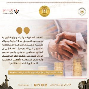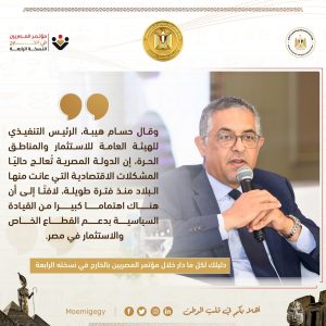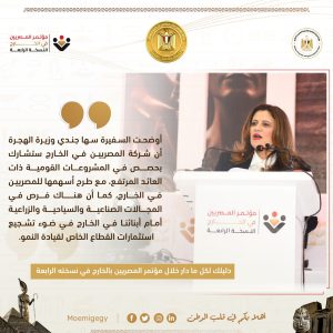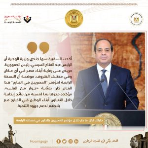 وأكدت السفيرة سها جندي، وزيرة الدولة للهجرة وشئون المصريين في الخارج، أن الرئيس عبد الفتاح السيسي، رئيس الجمهورية، حريص على رعاية أبناء مصر في أي مكان وفي مختلف الظروف، لافتًا إلى أن النسخة الرابعة لمؤتمر المصريين في الخارج هذا العام كان بمثابة «حوار من القلب»، مؤكدة فخرها بما لمسته من نتائج إيجابية خلال التعاون أبناء الوطن في الخارج مع بلادهم لدعم جهود التنمية.