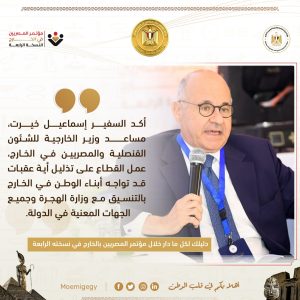 فيما، أكد مساعد وزير الخارجية للشئون القنصلية والمصريين في الخارج السفير إسماعيل خيرت، عمل القطاع على تذليل أية عقبات قد تواجه أبناء الوطن في الخارج بالتنسيق مع وزارة الهجرة وشئون المصريين في الخارج، وجميع الجهات المعنية في الدولة.