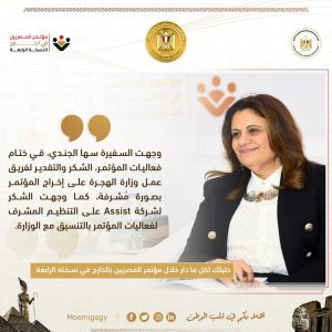 وفي ختام فعاليات المؤتمر، وجهت السفيرة سها الجندي، الشكر والتقدير لفريق عمل الوزارة العامل على إخراج المؤتمر بصورة مُشرفة، كما وجهت الشكر لشركة Assist على التنظيم المشرف لفعاليات المؤتمر بالتنسيق مع الوزارة.