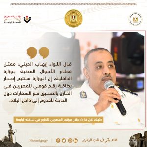 بينما، قال اللواء إيهاب الحيني، ممثل قطاع الأحوال المدنية بوزارة الداخلية، إن الوزارة ستتيح إصدار بطاقة رقم قومي للمصريين في الخارج بالتنسيق مع السفارات دون الحاجة للقدوم إلى داخل البلاد.