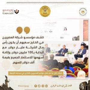 وذكر مؤسسو شركة المصريين في الخارج، خلال فعاليات المؤتمر، أنهم يسعون ليكون رأس مال الشركة مليار دولار، مع البداية بـ100 مليون دولار، وإتاحة أسهمها للاستثمار للجميع بقيمة ألف دولار للسهم.