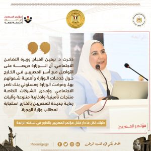 وفي مجال الرعاية الاجتماعية، ذكرت نيفين القباج، وزيرة التضامن الاجتماعي، أن الوزارة حريصة على التواصل مع أسر المصريين في الخارج حول خدمات الوزارة وأهمية شمولهم بها، وعرضت الوزارة ومسئولي بنك ناصر الاجتماعي وإحدى شركات القطاع الخاص، منتجات تأمينية وادخارية متنوعة وآليات رعاية جديدة للمصريين بالخارج استجابة لمطالب وزارة الهجرة.