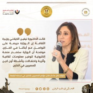 وفي المجال الثقافي، أكدت الدكتورة نيفين الكيلاني، وزيرة الثقافة، حرص الوزارة على التواصل مع أبنائنا في الخارج، موضحًا أن الوزارة سنُصدر منصة إلكترونية لتوفير معلومات ثقافية وأثرية واحتفالات وأنشطة أون لاين للمصريين في الخارج.