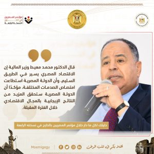 وخلال فعاليات المؤتمر، أكد الدكتور محمد معيط، وزير المالية، أن الاقتصاد المصري يسير في الطريق السليم، وأن الدولة المصرية استطاعت امتصاص الصدمات المختلفة، مؤكدًا أن الدولة المصرية ستحقق المزيد من النتائج الإيجابية بالمجال الاقتصادي خلال الفترة المقبلة.