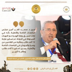 وقال الدكتور محمد الغر، أمين مجلس الجامعات الخاصة والأهلية، إنه في إطار تنسيق وزارة الهجرة مع الجهات المسئولة في الدولة، تم تسكين قرابة 12 ألف طالب وطالبة من القادمين من روسيا والسودان في الجامعات الخاصة والأهلية، ويجري تسكين 3 آلاف طالب وطالبة أخرين.