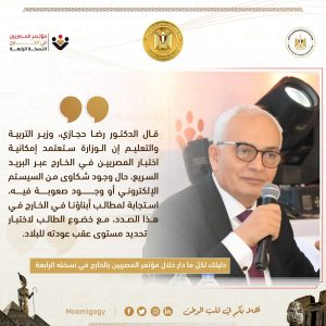 وأكد الدكتور رضا حجازي، وزير التربية والتعليم والتعليم الفني، أن الوزارة ستعتمد إمكانية اختبار المصريين في الخارج عبر البريد السريع، حال وجود شكاوى من السيستم الإلكتروني أو وجود صعوبة فيه، وذلك استجابة لمطالب أبناؤنا في الخارج في هذا الصدد، مع خضوع الطالب لاختبار تحديد مستوى عقب عودته للبلاد.
