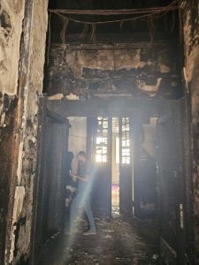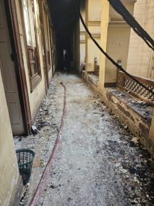 وتبين من المعاينة: أنه بحلول الساعة التاسعة والنصف تقريبًا من صباح أمس السبت الموافق ٥ / ٨ / ٢٠٢٣ شبَّ حريق بغرفة الخوادم بالطابق الأول فوق الأرضي صعودًا إلى أعلى المبنى؛ مما أسفر عن الاحتراق الكامل لبعض حجرات الدور الأول فوق الأرضي، والسطح الخاص بالمبنى، مسببًا عددًا من التلفيات الجاري حصرها.