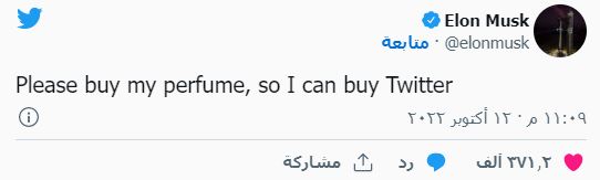 وقال ماسك لمتابعيه: “أرجوكم اشتروا كي أشتري تويتر”، فانهالت عليه التعليقات مستغربة من فكرة ربط الفكرتين سوية، أتى هذا الجدل بعدما غيّر ماسك معلوماته التعريفية على موقع “تويتر”، واصفاً نفسه “ببائع عطور“.