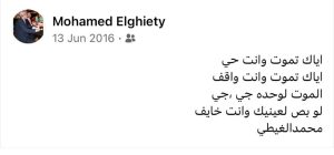 ونشر نفس القصيدة على صفحته بالفيس بوك والتي مطلعها (اياك تموت وانت حي..اياك تموت وانت واقف..الموت لوحده جي جي لو بص لعينيك وانت خايف)، وقد ضم المحامي ميشيل حليم المستندات اللازمة التي تثبت حق الملكية الفكرية للغيطي وأن محمد رمضان سرق حقه المادي والأدبي ونشره في واقعة سطو وسرقة دامغين.