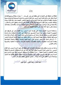 ودﻋًﻣﺎ ﻣن ﺣزب ﻣﺳﺗﻘﺑل وطن ﻟﺟﻣﯾﻊ ھذه اﻹﻧﺟﺎزات اﻟﺗﻲ ﺗﺣﻘﻘت ﻓﻲ ﻋﮭد اﻟرﺋﯾس ﻋﺑد اﻟﻔﺗﺎح اﻟﺳﯾﺳﻲ، وإذ ﺗﻣﺿﻲ اﻟدوﻟﺔ اﻟﻣﺻرﯾﺔ بخطى ﺛﺎﺑﺗﺔ ﻧﺣو إﺗﻣﺎم أﺣد أھم اﻻﺳﺗﺣﻘﺎﻗﺎت اﻟدﺳﺗورﯾﺔ اﻟﻣﺗﻌﻠﻘﺔ ﺑﺈﺗﻣﺎم اﻻﻧﺗﺧﺎﺑﺎت اﻟرﺋﺎﺳﯾﺔ اﻟﻣﻘﺑﻠﺔ، ﻟذا واﻧطﻼﻗًﺎ ﻣن ﻣﺳﺋوﻟﯾﺗﻧﺎ اﻟﺳﯾﺎﺳﯾﺔ ﻓﺈﻧﻧﺎ ﻧؤﯾد وﻧدﻋم ﺗرﺷﺢ اﻟرﺋﯾس ﻋﺑد اﻟﻔﺗﺎح اﻟﺳﯾﺳﻲ ﻟﺧوض ﻏﻣﺎر اﻻﻧﺗﺧﺎﺑﺎت اﻟرﺋﺎﺳﯾﺔ اﻟﻣﻘﺑﻠﺔ، ﻟﺗﺣﻘﯾق ﺗطﻠﻌﺎت ھذا اﻟﺷﻌب وﻣواﺻﻠﺔ ﻣﺳﯾرة اﻟﻌطﺎء اﻟﺗﻲ ﺑدأھﺎ ﺳﯾﺎدﺗﮫ .. ﻣﺗﻣﻧﯾن اﻟﺗوﻓﯾق واﻟﺗﻘدم واﻻزدھﺎر ﻟﻣﺻر