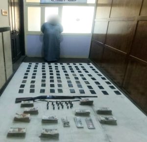 ضبط (أحد الأشخاص)، وبحوزته (90 طربة لمخدر الحشيش وزنت 9 كيلو جرام – بندقية خرطوش وطلقات لذات العيار – مبلغ مالى).