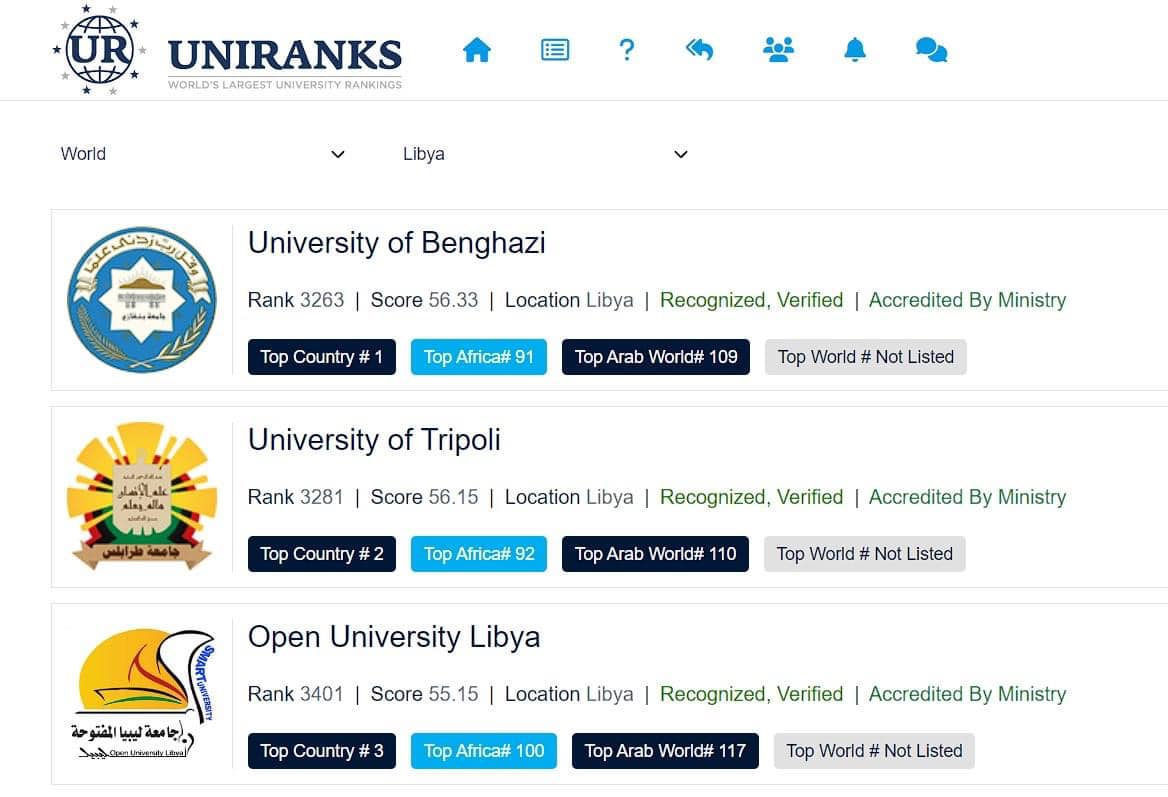 تصنيف Uniranks للجامعات يعرض مجموعة متنوعة من المعلومات حول الجامعات المدرجة، مثل الترتيب العام للجامعة والتقييم النسبي في القارة الأفريقية والعالم العربي. كما يوفر تفاصيل حول الموقع الجغرافي لكل جامعة ومعترف بها ومعتمدة من قبل الوزارة المختصة في ليبيا.