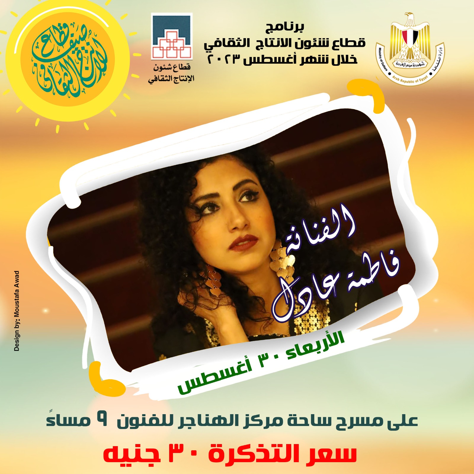 أما الجزء الثانى من الحفل، فتشدو فيه الفنانة “فاطمة عادل” وفرقتها الموسيقية، بباقة متنوعة من أشهر الأغانى لنحوم الطرب، بجانب أغانى من السيرة الهلالية .