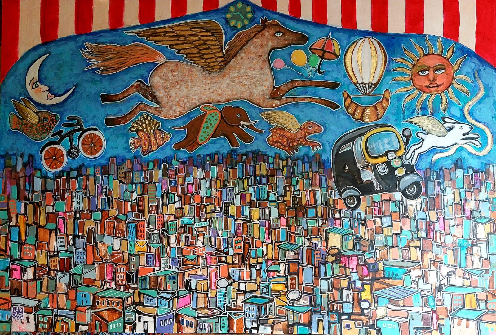 وكتبت ا. ريم داوود .. “نلاحظ في أعمال حمدان خياله الجامح.. الأحصنة المجنّحة التي تسبح في فضاءات المدينة، وتعلو فوق عماراتها وأبراجها السكنية، وثمار الفاكهة تتطاير حولها في خليطٍ من التناغم والفوضى يشبه تمامًا ما نراه في أرجاء المدينة. نراها أيضًا في هيئة سيرك صاخب، يغري بالمشاركة والاستمتاع. نرى كلّ ذلك، وأكثر، في لوحاتٍ تعبّر عن نظرتنا المتباينة إزاء هذه المدينة العريقة، الفاتنة، الساحرة، رغم كل شيء”.