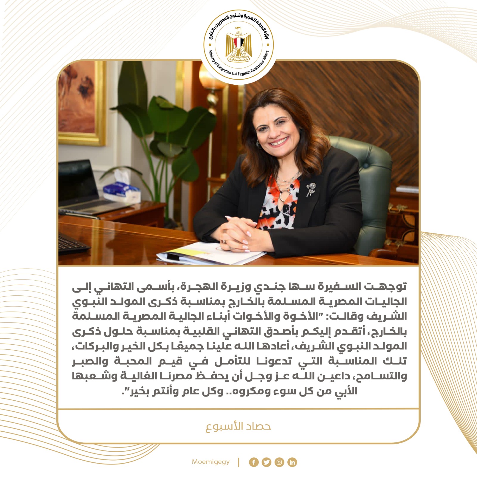 8- توجهت السفيرة سها جندي وزيرة الهجرة، بأسمى التهاني إلى الجاليات المصرية المسلمة بالخارج بمناسبة ذكرى المولد النبوي الشريف وقالت: “الأخوة والأخوات أبناء الجالية المصرية المسلمة بالخارج، أتقدم إليكم بأصدق التهاني القلبية بمناسبة حلول ذكرى المولد النبوي الشريف، أعادها الله علينا جميعًا بكل الخير والبركات، تلك المناسبة التي تدعونا للتأمل في قيم المحبة والصبر والتسامح، داعين الله عز وجل أن يحفظ مصرنا الغالية وشعبها الأبي من كل سوء ومكروه.. وكل عام وأنتم بخير”.