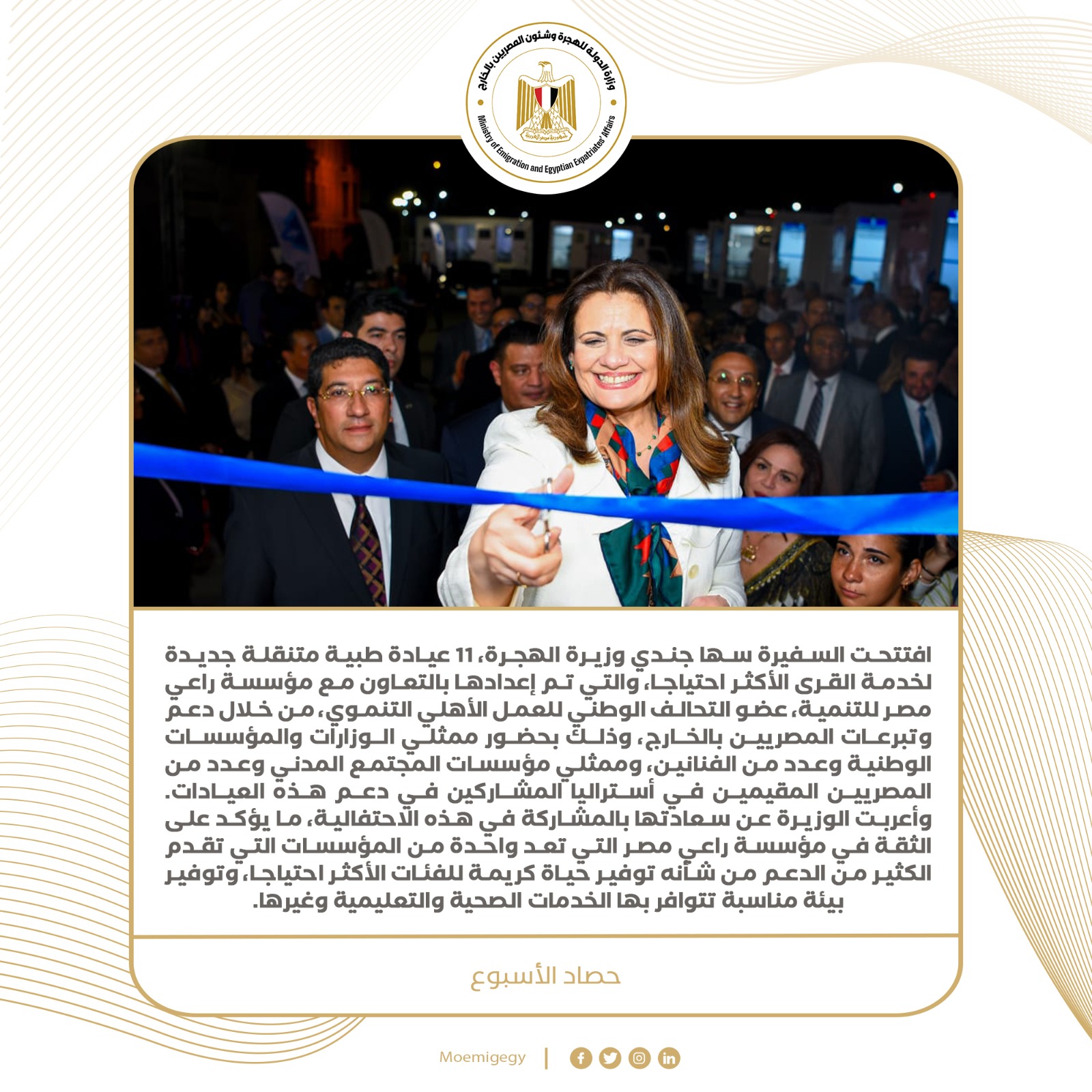 4- افتتحت السفيرة سها جندي وزيرة الهجرة، 11 عيادة طبية متنقلة جديدة لخدمة القرى الأكثر احتياجا، والتي تم إعدادها بالتعاون مع مؤسسة راعي مصر للتنمية، عضو التحالف الوطني للعمل الأهلي التنموي، من خلال دعم وتبرعات المصريين بالخارج، وذلك بحضور ممثلي الوزارات والمؤسسات الوطنية وعدد من الفنانين، وممثلي مؤسسات المجتمع المدني وعدد من المصريين المقيمين في أستراليا المشاركين في دعم هذه العيادات. وأعربت الوزيرة عن سعادتها بالمشاركة في هذه الاحتفالية، ما يؤكد على الثقة في مؤسسة راعي مصر التي تعد واحدة من المؤسسات التي تقدم الكثير من الدعم من شأنه توفير حياة كريمة للفئات الأكثر احتياجا، وتوفير بيئة مناسبة تتوافر بها الخدمات الصحية والتعليمية وغيرها.