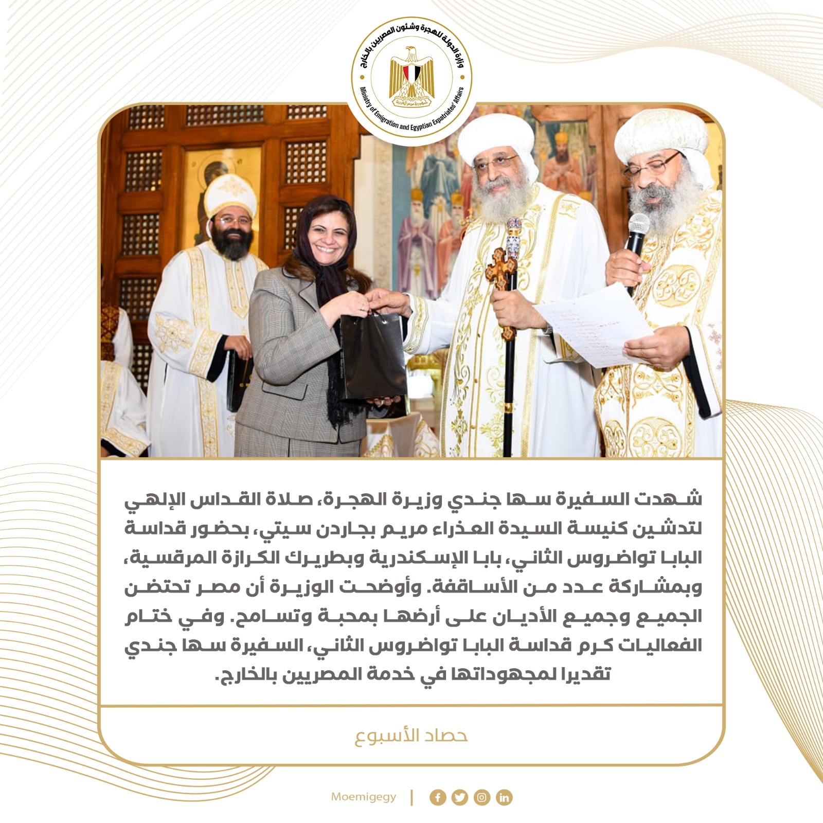 2- شهدت السفيرة سها جندي وزيرة الهجرة، صلاة القداس الإلهي لتدشين كنيسة السيدة العذراء مريم بجاردن سيتي، بحضور قداسة البابا تواضروس الثاني، بابا الإسكندرية وبطريرك الكرازة المرقسية، وبمشاركة عدد من الأساقفة. وأوضحت الوزيرة أن مصر تحتضن الجميع وجميع الأديان على أرضها بمحبة وتسامح. وفي ختام الفعاليات كرم قداسة البابا تواضروس الثاني، السفيرة سها جندي تقديرا لمجهوداتها في خدمة المصريين بالخارج.