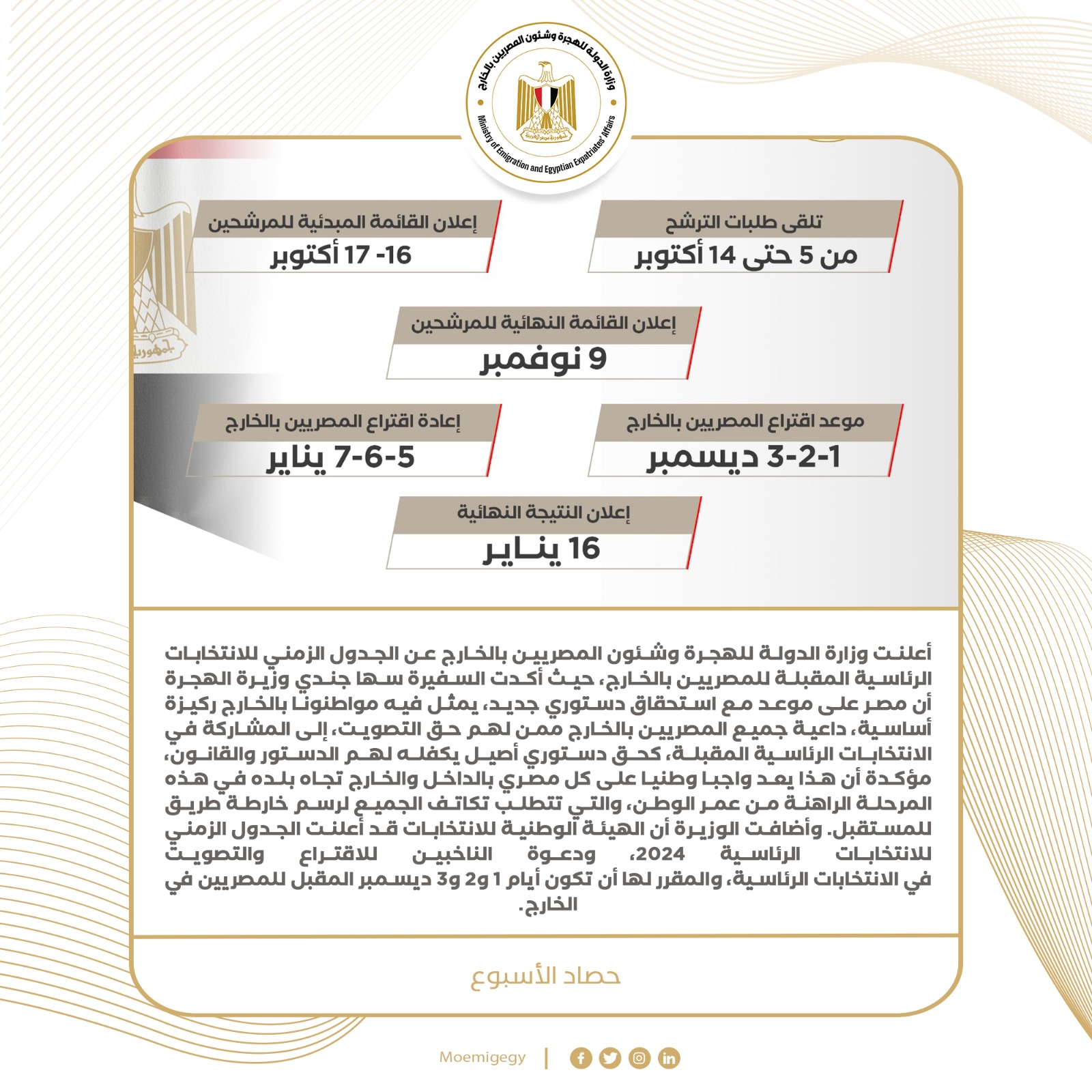 3- أعلنت وزارة الدولة للهجرة وشئون المصريين بالخارج عن الجدول الزمني للانتخابات الرئاسية المقبلة للمصريين بالخارج، و أكدت السفيرة سها جندي وزيرة الهجرة أن مصر على موعد مع استحقاق دستوري جديد، يمثل فيه مواطنونا بالخارج ركيزة أساسية، داعية جميع المصريين بالخارج ممن لهم حق التصويت، إلى المشاركة في الانتخابات الرئاسية المقبلة، كحق دستوري أصيل يكفله لهم الدستور والقانون، مؤكدة أن هذا يعد واجبا وطنيا على كل مصري بالداخل والخارج تجاه بلده في هذه المرحلة الراهنة من عمر الوطن، والتي تتطلب تكاتف الجميع لرسم خارطة طريق للمستقبل. وأضافت الوزيرة أن الهيئة الوطنية للانتخابات قد أعلنت الجدول الزمني للانتخابات الرئاسية 2024، ودعوة الناخبين للاقتراع والتصويت في الانتخابات الرئاسية، والمقرر لها أن تكون أيام 1 و٢ و٣ ديسمبر المقبل للمصريين في الخارج.