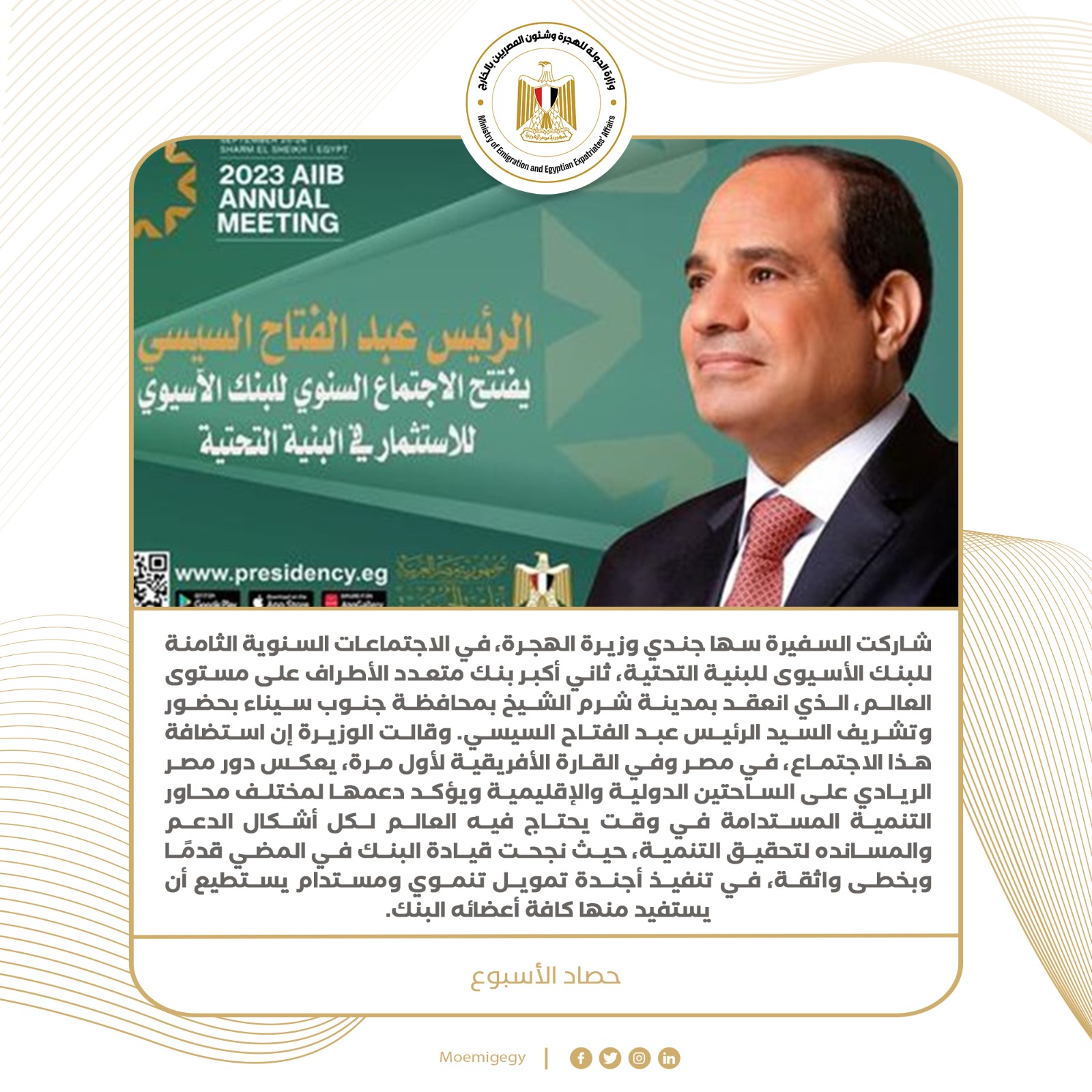 1- مشاركتها في الاجتماعات السنوية الثامنة للبنك الآسيوي للبنية التحتية، ثاني أكبر بنك متعدد الأطراف على مستوى العالم، الذي انعقد بمدينة شرم الشيخ بمحافظة جنوب سيناء بحضور وتشريف السيد الرئيس عبد الفتاح السيسي. وقالت الوزيرة إن استضافة هذا الاجتماع، في مصر وفي القارة الأفريقية لأول مرة، يعكس دور مصر الريادي على الساحتين الدولية والإقليمية ويؤكد دعمها لمختلف محاور التنمية المستدامة في وقت يحتاج فيه العالم لكل أشكال الدعم والمساندة لتحقيق التنمية، حيث نجحت قيادة البنك في المضي قدمًا وبخطى واثقة، في تنفيذ أجندة تمويل تنموي ومستدام يستطيع أن يستفيد منها كافة أعضائه البنك.