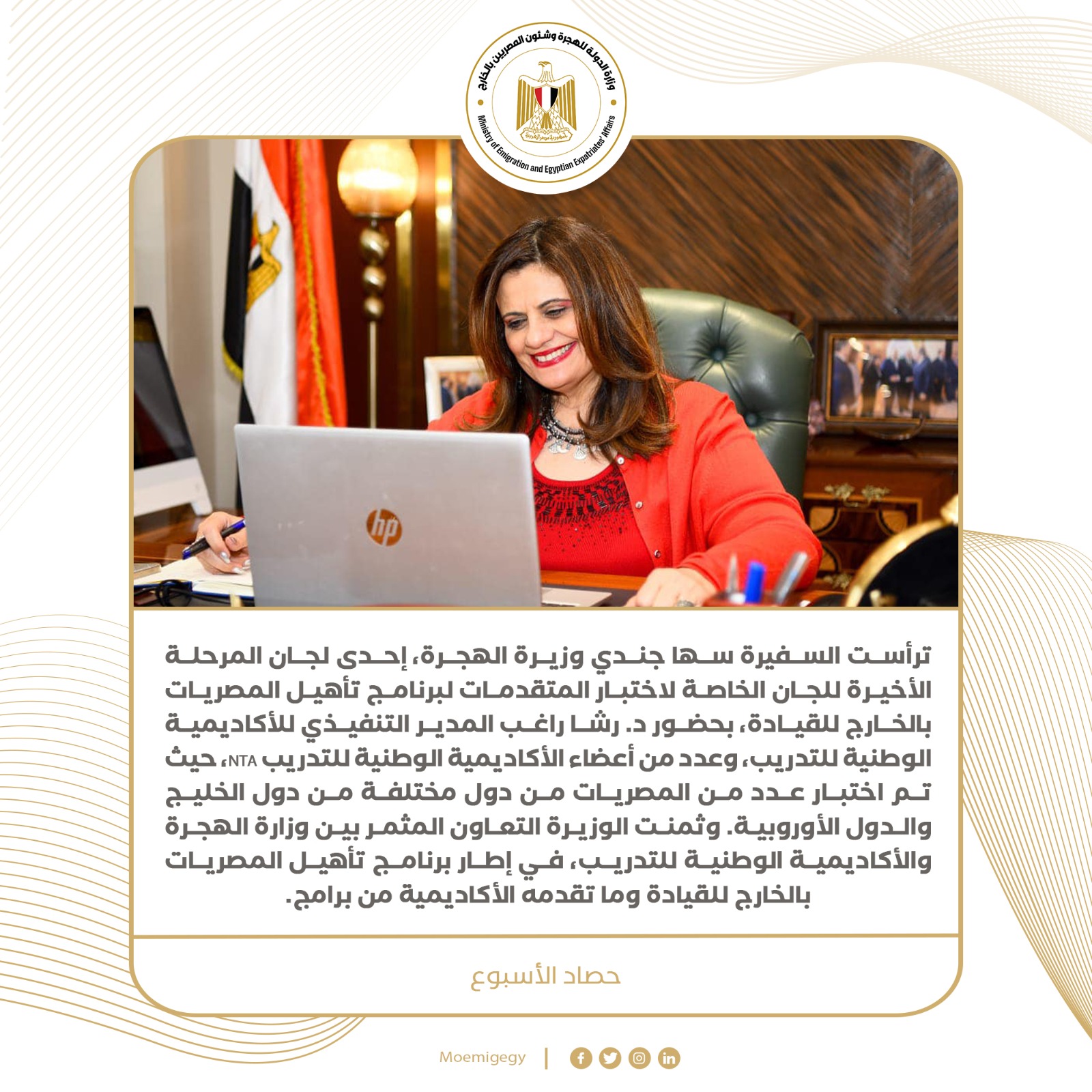 أصدرت وزارة الهجرة تقريراً مفصلاً عن نشاط الوزيرة سها جندى على مدار أسبوع وتضمن