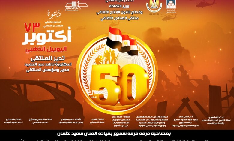 يقيم قطاع شئون الإنتاج الثقافى برئاسة المخرج خالد جلال، ملتقى الهناجر الثقافي الشهرى، تحت عنوان “أكتوبر 73 واليوبيل الذهبي” فى السابعة والنصف من مساء غد السبت، بمركز الهناجر للفنون برئاسة الفنان شادى سرور.